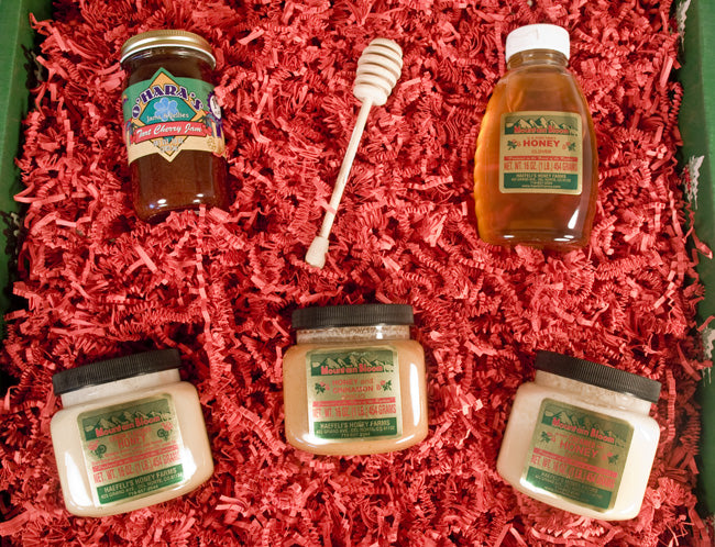 One of the sweetest gifts you can give! Four of Haefeli's most delicious honeys. Box includes 16 oz. of Haefeli's pure, raw, liquid clover honey and 16 oz. each of our creamed, cinnamon and lemon honeys. We've also included an all-natural 12oz. jam straight from Colorado. A honey dipper is used to drizzle these sweet treats onto toast, pancakes, ice cream or into your coffee or tea.