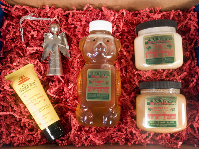 Warm up with this delicious treat from Haefeli's! The gift box includes a 16 oz. lemon honey, 16 oz. cinnamon honey, and a 24 oz. honey bear filled with Haefeli's premium high altitude clover honey. What could be better? Also included is a beautiful, high-quality ornament* and a bottle of Naked Bee lotion.